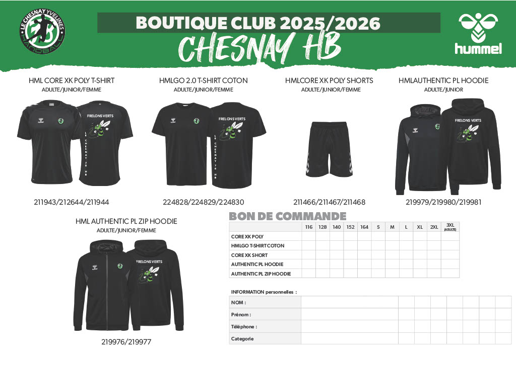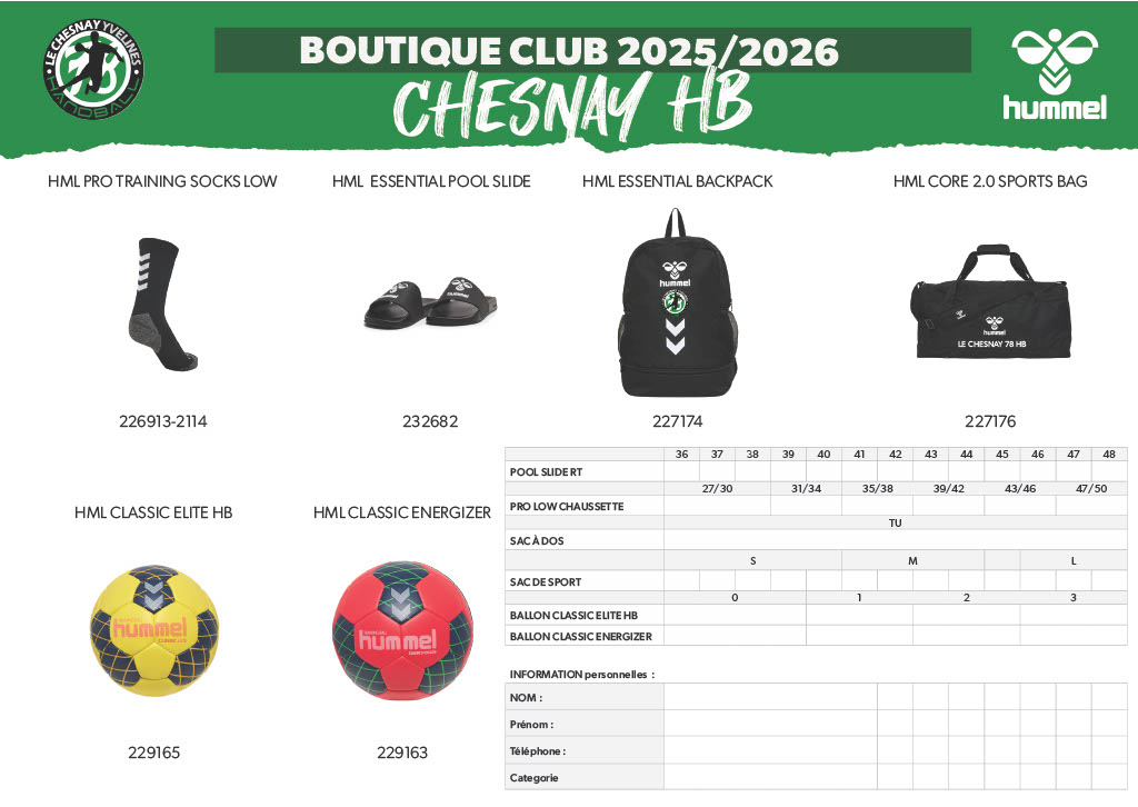 Bonjour, la boutique en ligne pour les équipements liés uniquement au Chesnay Yvelines Handball est en cours de construction par notre partenaire-équipementier Hummel. Bientôt, vous pourrez commander et payer en ligne vos produits et venir les récupérer au Magasin Hand-Expert de Montigny. Vous pouvez déjà commander en utilisant le coupon papier ci-dessous.